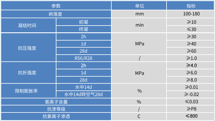 早强高强:抗压强度2h≥30MPa,后期强度持续增长,28d≥60MPa